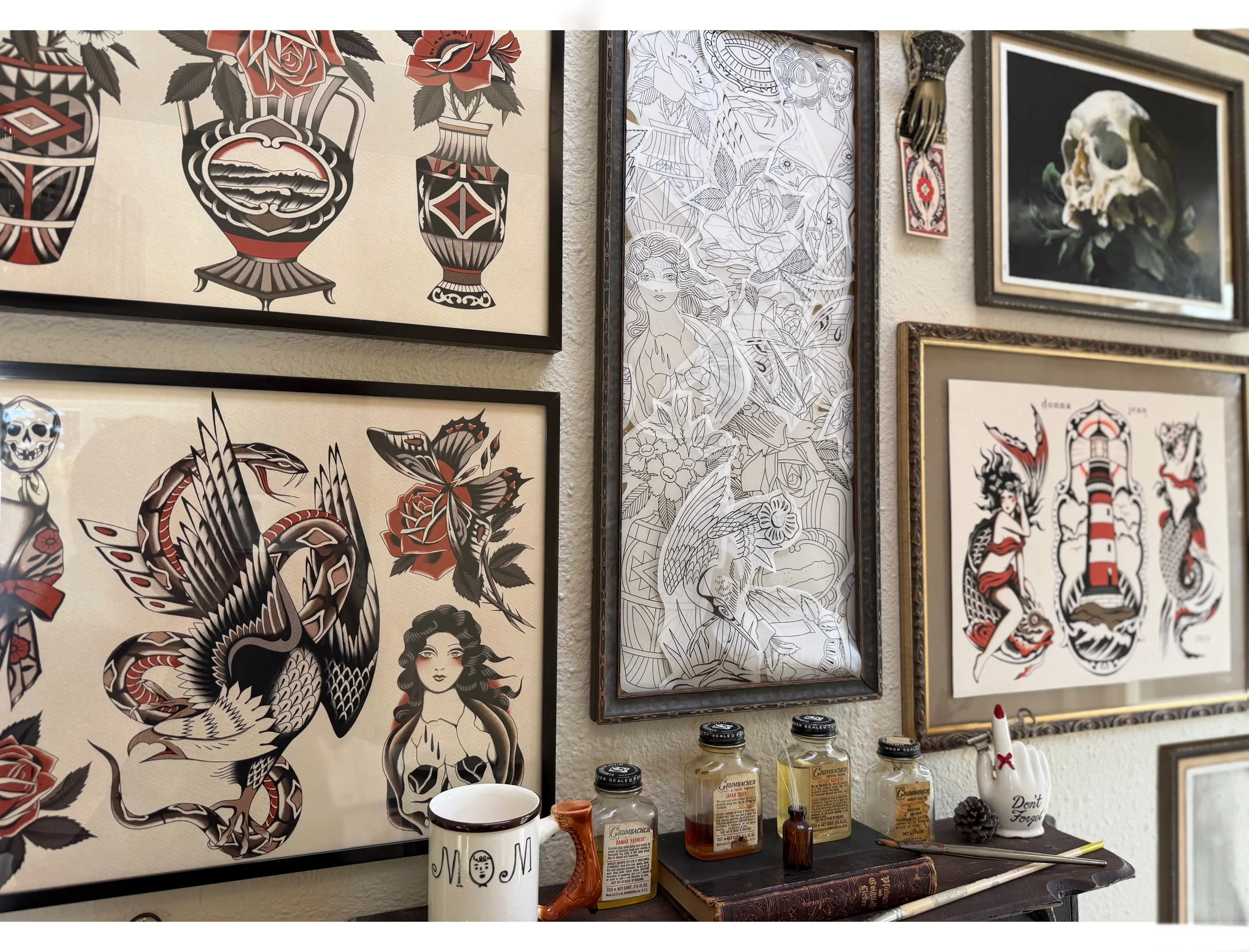 Located in Portland Oregon, Donna is a tattooer and painter who specializes in a unique traditional style that blends themes of classic tattooing with antique illustration